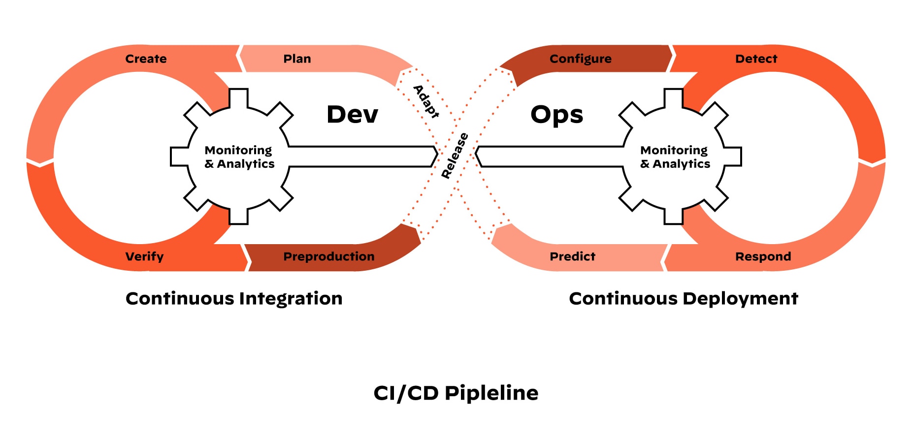 DevOps is a cycle of continuous integration and continuous delivery (or continuous deployment), otherwise known as the CI/CD pipeline. The CI/CD pipeline integrates development and operations teams to improve productivity by automating infrastructure and workflows as well as continuously measuring application performance. It looks like this: