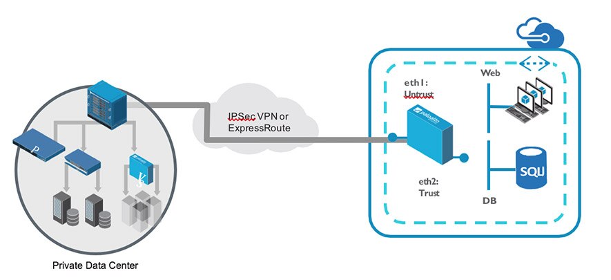 shared infrastructure. An introduction to the Azure VNet can be found here. On the left side of the image is the existing private data center with redundant connectivity to the Azure VNet. In this example, a new, two-tiered application with database and web tiers is deployed in the public cloud. The VM-Series in the VNet is securing the traffic in and out of the VNet, as well as east-west traffic within the VNet, just as the physical firewall in the private data center might do.